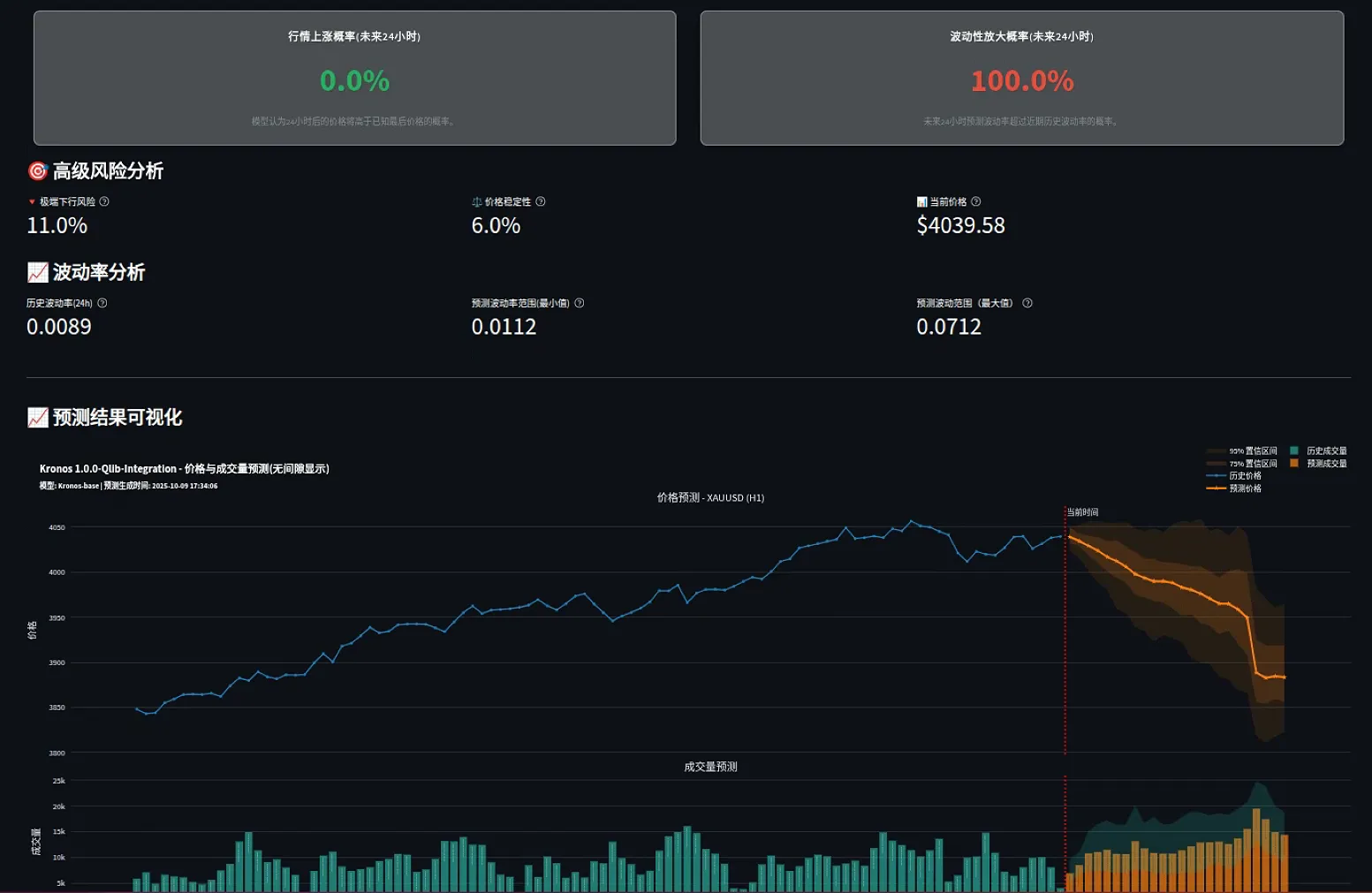 下面的内容讲的可能有点深,直接上图大家看看效果吧,主要功能就是预测行情方向和波动率,特色是全球首款针对K线时间序列的预测模型,清华大学的研究成果