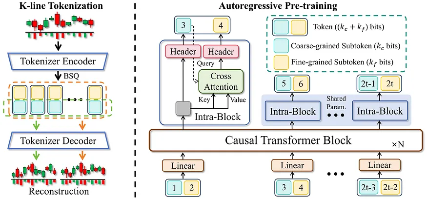 粗细子 Token:每个 Token 包含粗粒度与细粒度子 Token,通过分层重构损失优化。粗粒度编码大体市场状态,细粒度补充细节。