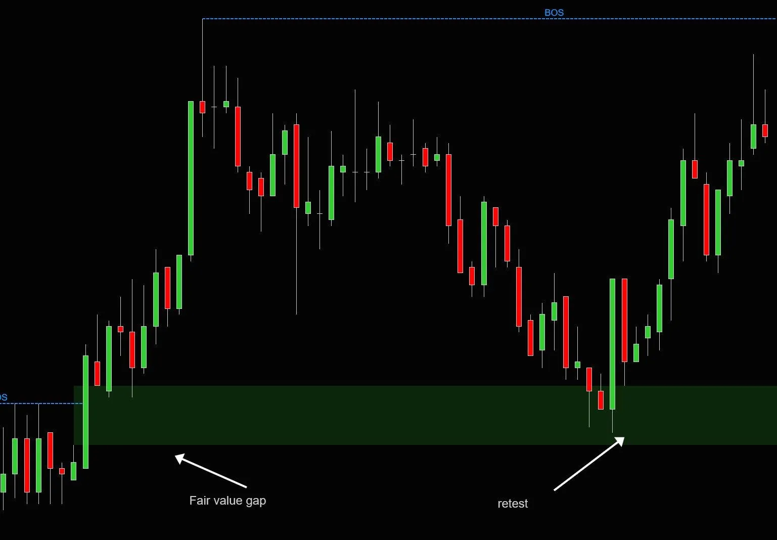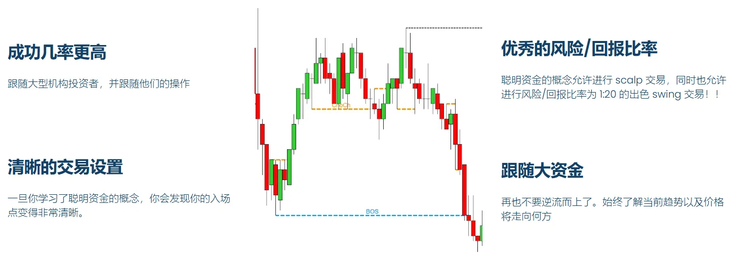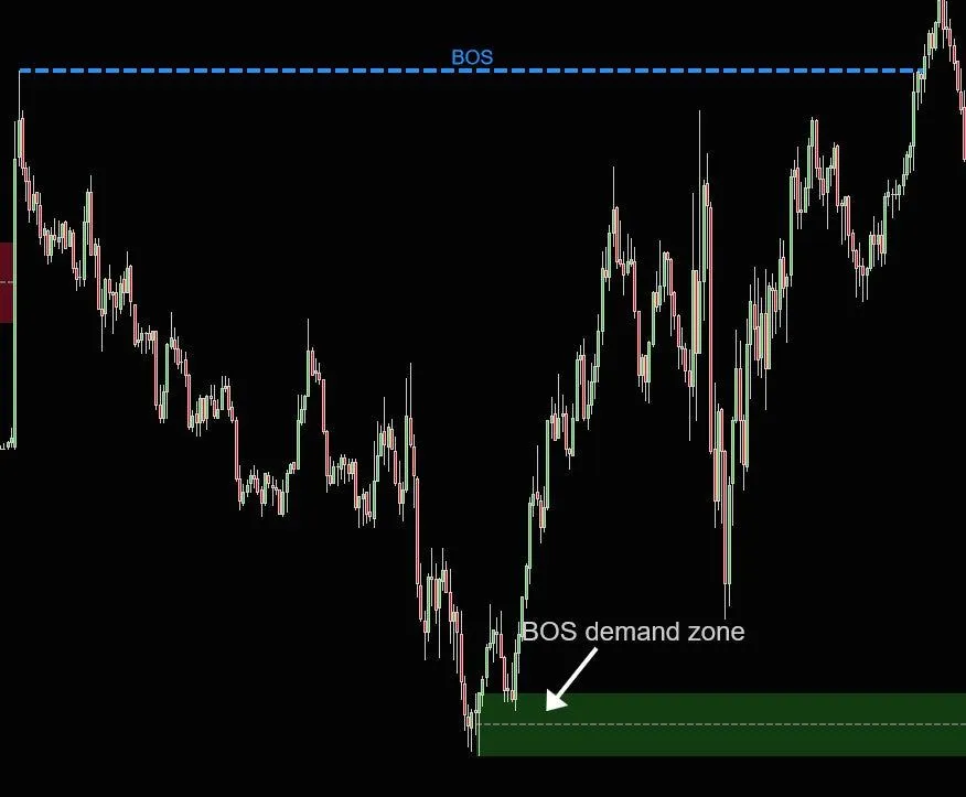 市场结构是大局观,它能检测并显示趋势,以及检测趋势的变化。通过复杂的算法,它能够检测主要的高点和低点,并在图表上绘制这些点。趋势变化,也称为结构突破(BOS),在发生时会标记在图表上。以下截图显示了向上突破结构(BOS),确认了上升趋势,以及稍后向下突破结构(BOS),确认了趋势已经改变,现在是下降趋势。请注意,BOS 本身不是交易入场信号。它只是告诉我们想要交易的方向。因此,向上突破结构(BOS)确认了上升趋势,这意味着我们只会寻找多头入场机会。向下突破结构(BOS)确认了下降趋势,这意味着我们只会寻找空头入场机会。