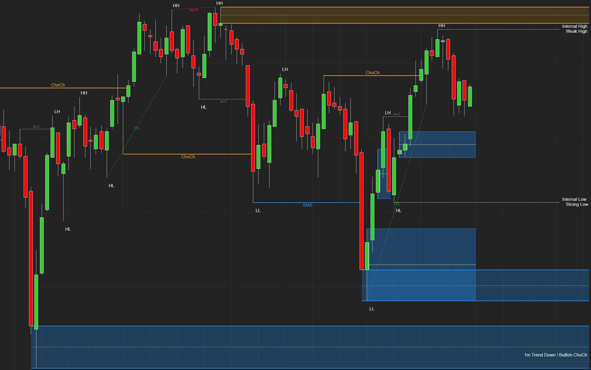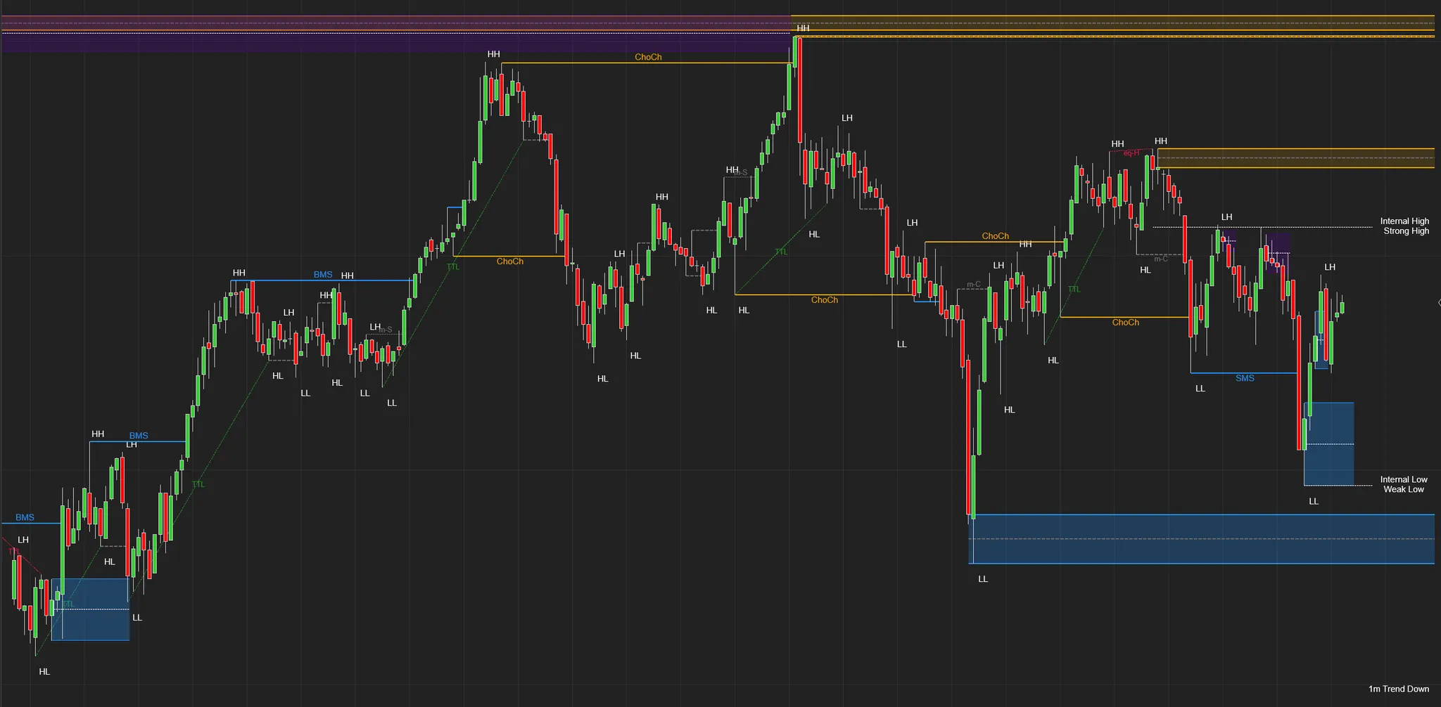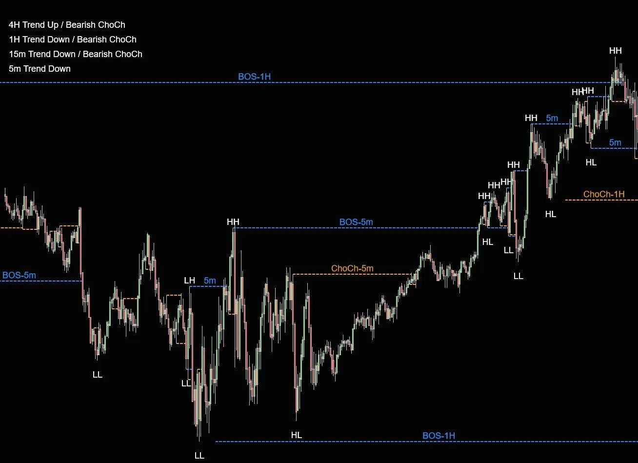要完成此操作,您需要进入指标设置并勾选使用 MTF 复选框。接下来,选择您想要显示的时间框架,这样就完成了。现在,指标将显示您选择的时间框架在图表上的市场结构。如果您想在一张图表上显示多个时间框架,只需将指标多次添加到图表中,并更改每个实例的 MTF 设置。例如,我可能在图表上放置 4 个市场结构指标,图表是 1 分钟 K 线图- 第 1 个指标设置为显示 MTF 1 天- 第 2 个指标设置为显示 MTF 240 分钟(4 小时)- 第 3 个指标设置为显示 MTF 15 分钟- 第 4 个指标不使用 MTF,它只显示当前图表时间框架的结构: