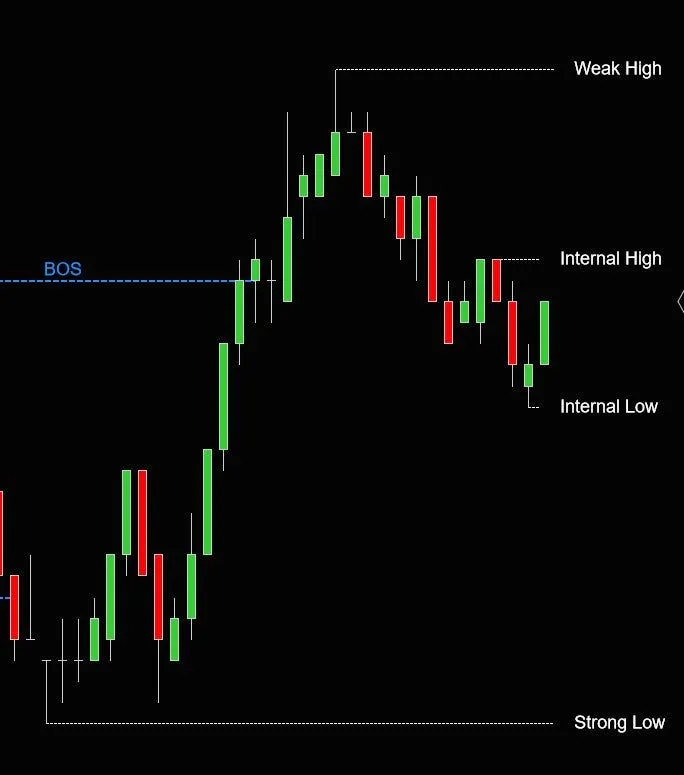 该指标显示最后一个重要的波动高点和低点,以及它是强还是弱。- 当高点之后形成了一个新低时,出现强高。如果高点未能创出新低,则我们认为它是弱高- 当低点之后形成了一个新高时,出现强低。如果低点未能创出新高,则我们认为它是弱低一般来说,我们总是在寻找交易入场点:- 以上次 BOS 定义的趋势为准- 并且在向弱势低点或弱势高点的方向为什么我们要在弱势低点或弱势高点进行交易?因为我们假设强势高/低将会持续。记住,如果低点能够创出新高,那么它就成为一个非常强势的低点。为了能够创出新高,大量的资金投入到了那个低点。那么在创出新高之后,我们期待什么?我们期待一个回调,形成更高的低点。由于在创出新高过程中涉及了大量的资金,我们不会期待价格反转并突破那个强势低点。相反,我们期待回调形成新的 HL,然后突破弱势高点,形成新的 HH。