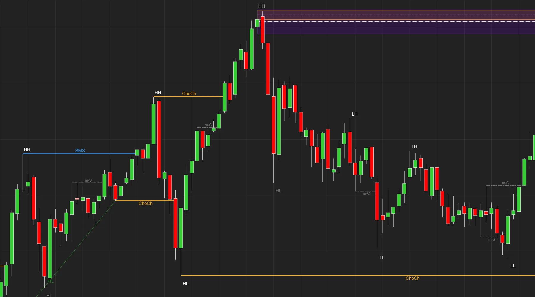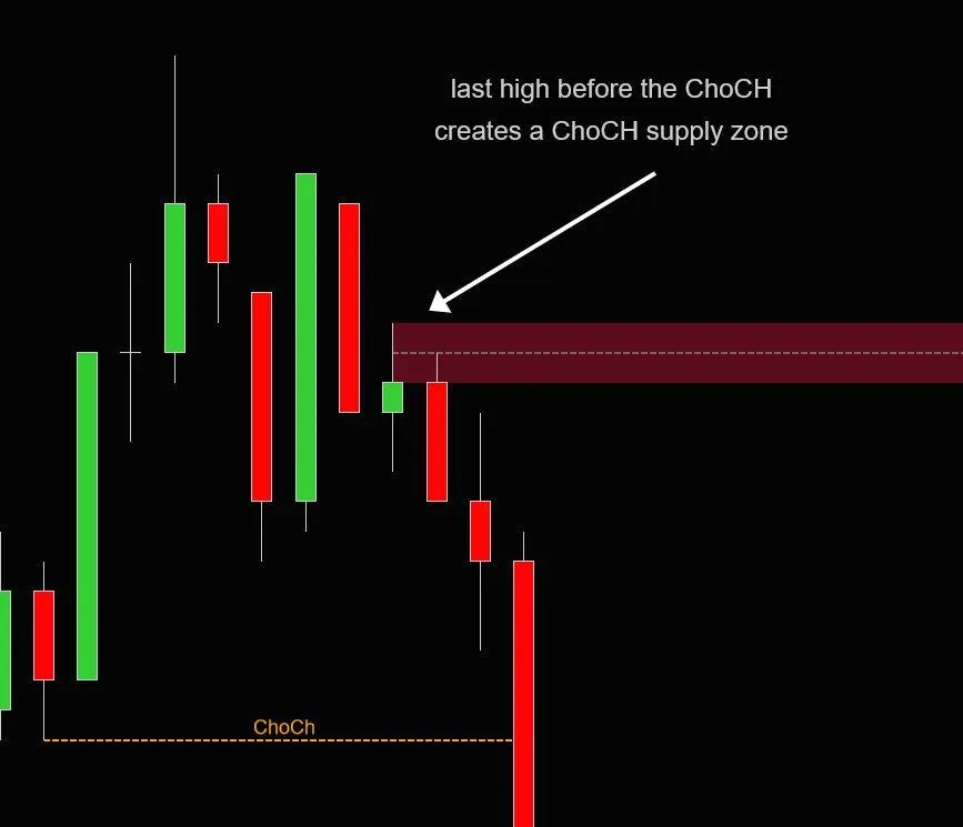 ChoCH 供需区域是从 ChoCH 形成前的最后一个高点或低点绘制的。例如,在右侧的屏幕截图中,我们可以看到熊市的 ChoCH。在这种情况下,ChoCH 之前的最后一个高点是绿色上涨蜡烛。然后,这个上涨蜡烛被用来创建供应区域这些供需区域通常充当支撑/阻力区域。但请注意,ChoCH 区域不如 BOS 供需区域强劲。