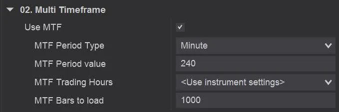 该指标的独特之处在于能够在一张图表上显示多个时间框架的市场结构。以下截图显示了在 NinjaTrader 中这会是什么样子。如您所见,我们在 5 分钟图表中添加了 4 个 TDU 市场结构指标。每个指标都有不同的 MTF 周期设置,并从不同的时间框架显示市场结构。这样我们就可以在一张图表中看到4小时、1小时、15分钟和5分钟的市场结构。