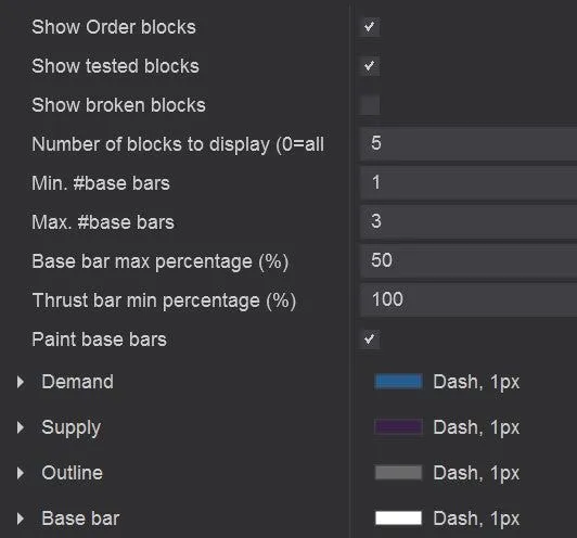 在设置中,您可以选择显示订单块,以及是否显示已测试和已破的订单块,以及您想显示多少个订单块。在这个例子中,它只显示了最近的5个订单块,以保持图表整洁。最小/最大 K 线定义了在考虑它为区间之前应该形成多少根 K 线。在这种情况下,当区间为 1-3 根 K 线时,将检测到该区间。基础柱状图最大百分比定义了柱状图是否被视为推力柱。推力柱最小百分比定义了推力柱应该有多大才能被视为突破。