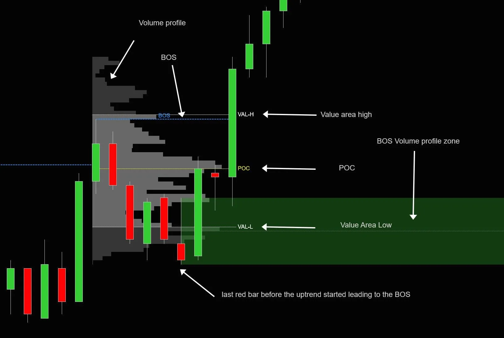 BOS 量价分布图是从 BOS 开始到 BOS 线断裂时计算的量价分布图。量价分布图将显示形成 BOS 时交易量最大的区域,以及控制点(POC)和价值区域。在上面的截图中,您可以查看量价分布图,以及价值区域的高低线和枢轴点线。POC 是 BOS 期间大部分交易发生的价格价值区域是 BOS 期间 68%的交易量发生的区域与任何量度分布一样,我们经常看到价值区域的高点、低点和枢轴点成为重要的水平。当价格回测这些水平时,它可能会找到继续趋势所需的流动性