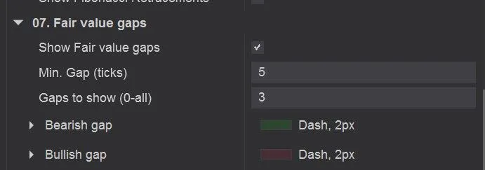 您可以定义最小价差(以 tick 为单位),这对于像 NQ 这样波动性很强的工具非常有用。对于这些工具,您可能希望设置比其他工具更大的价差。此外,您可以选择是否显示公允价值价差,如果是的话,应该显示多少个。在这个例子中,只有最近的3个价差将在图表上显示。