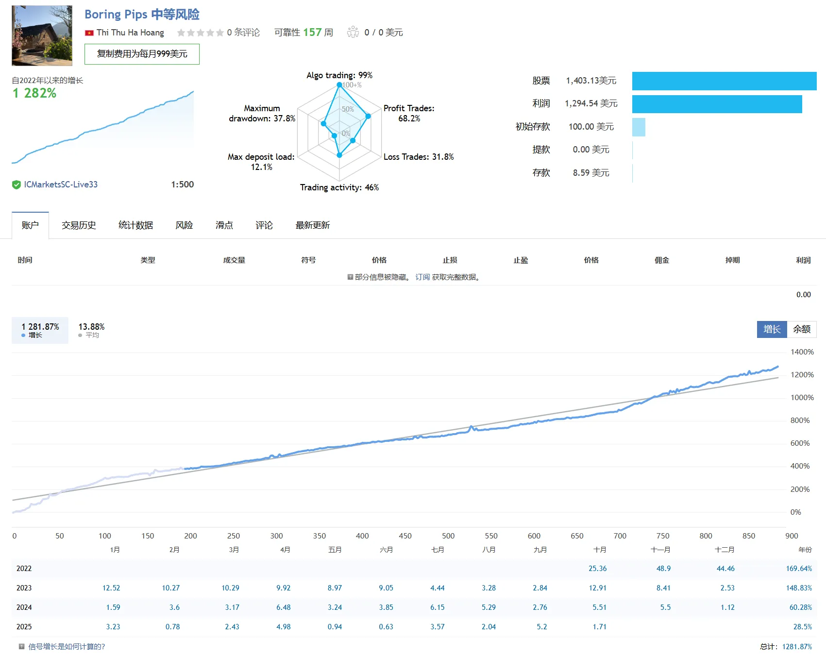 Boring Pips MT4 的“反过拟合”研发理念与公开的实盘跟踪,使其在商用 EA 中相对“务实”。从实盘数据看(157 周、PF 2.37、DD 38%、胜率 68%、平均持仓 3 天、多品种交易),它并非“极端曲线优美”的回测型产品,而是更接近“用时间换确定性”的中短线系统。对资金管理与执行质量比较在意、愿意长期跟踪的交易者,这款 EA/信号值得认真评估。