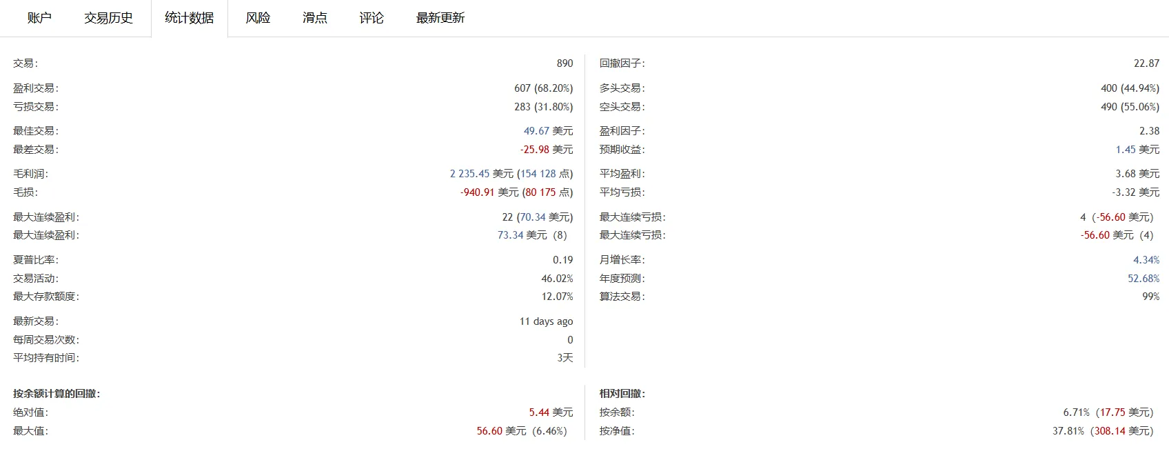 • 利润因子 2.37 与 890 笔交易(列表区“Trades”列)在样本量上具有一定参考价值;