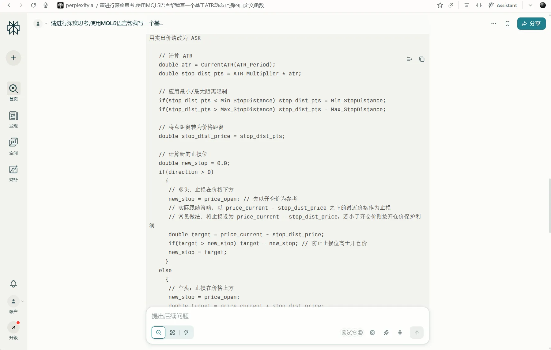 提示词:请进行深度思考,使用MQL5语言帮我写一个基于ATR动态止损的自定义函数