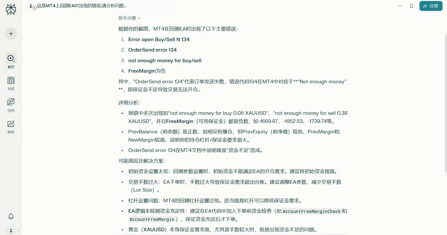 提示词:这是MT4上回测EA时出现的错误,请分析问题并给出解决方案