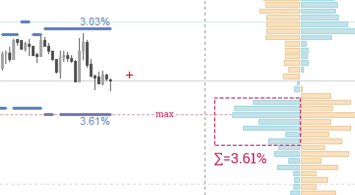 为了识别集群,算法将交替搜索订单簿中所有级别的值,直到找到七个相邻级别 ,其总和最大。给定的总和在图表上显示。在这七个级别中,选择交易量最大的级别。它被用作在图表上绘制 StopLossClusters 指标线的参考级别。