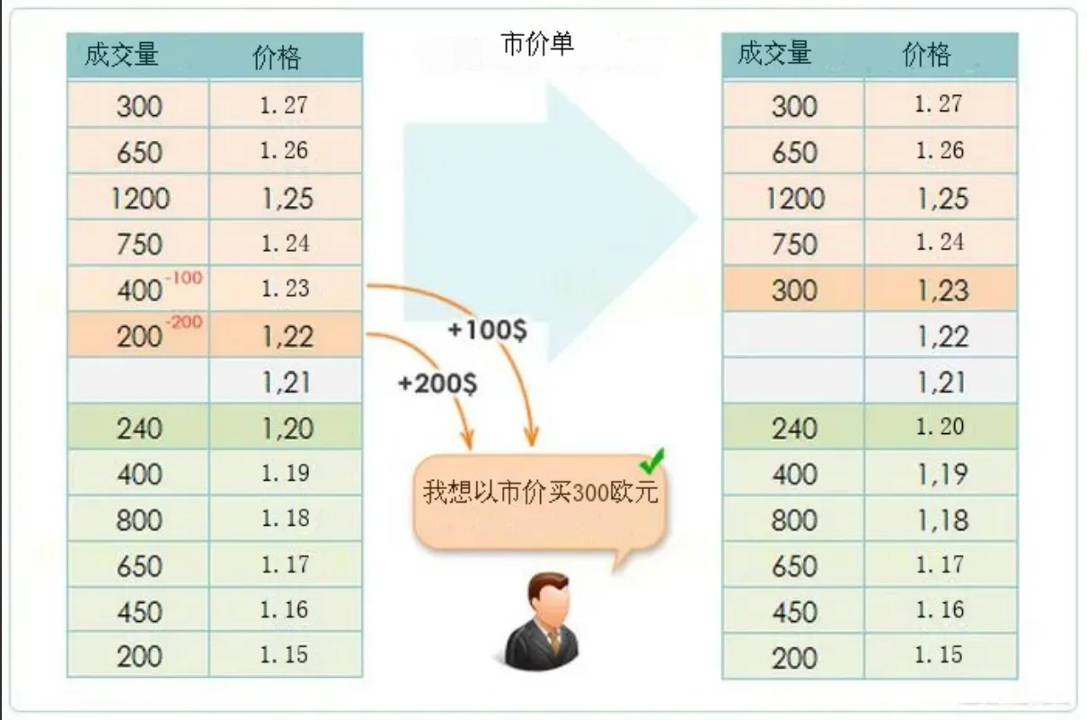 这些活跃的参与者以最佳市场价格购买被动参与者的限价单——这就是为什么他们的订单被称为市价单