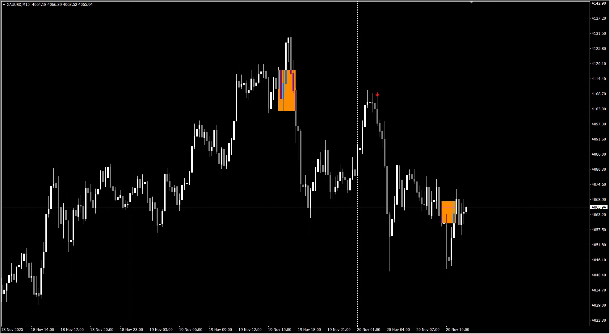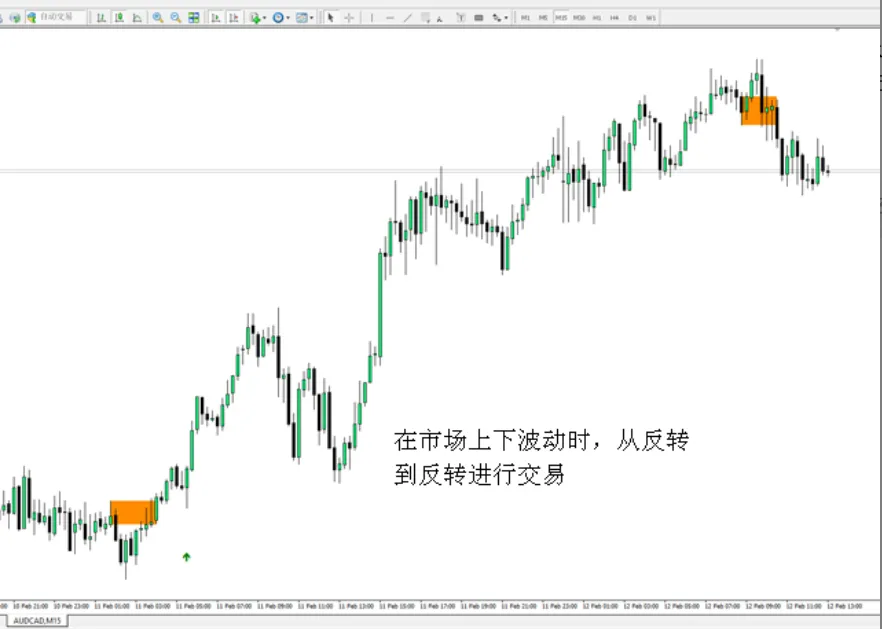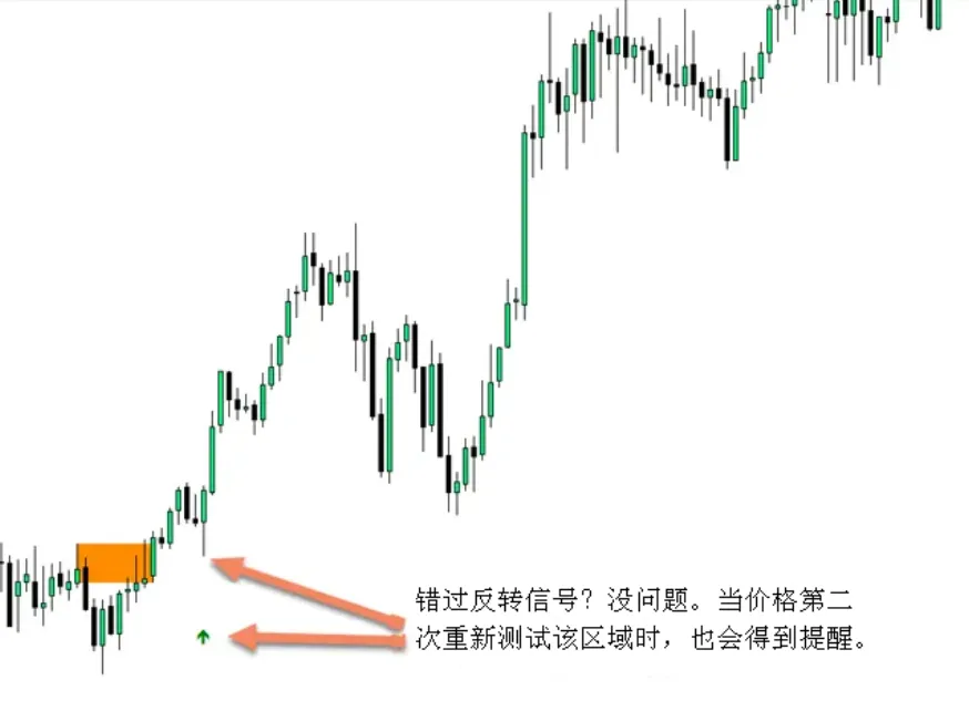 第二步:自动绘制矩形框 一旦发现潜在的反转点,指标就会在上一根颜色相反的K线上自动绘制一个矩形框。这个矩形框代表的是当前短期市场结构
