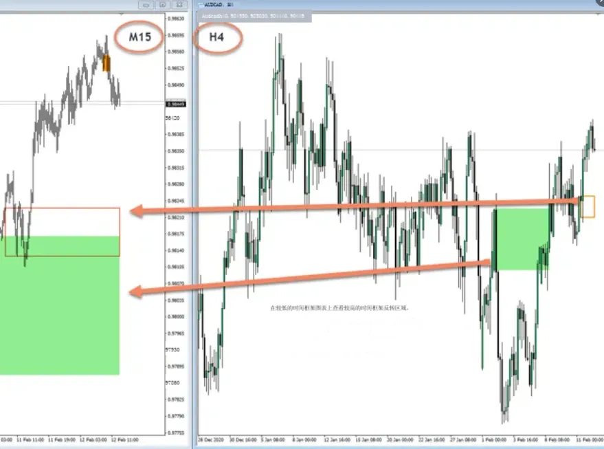4. 多时间框架联动 你可以在低时间框架的图表上查看高时间框架的反转矩形框。这对于那些做趋势追踪的交易者来说简直是「作弊神器」——你能同时掌握大趋势和小机会。