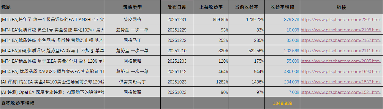 下面这些是我在2025年上架并持续追踪的实盘验证EA,包含策略类型、上架收益、当前收益和增幅: